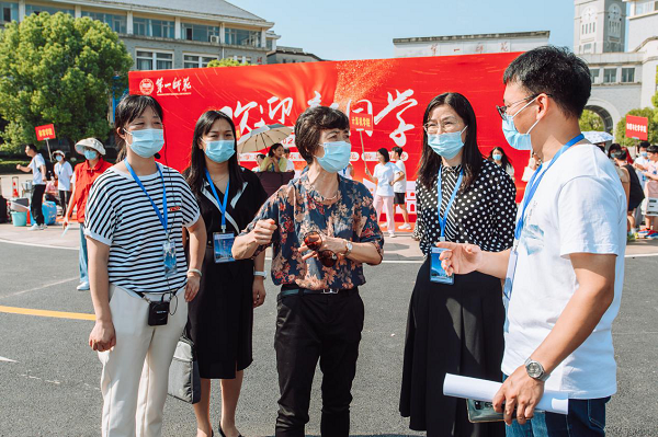 国基广场上更是人声鼎沸却又秩序井然,我校13个二级学院的迎新服务点集中设立在这里。今年我校新生报到手续实行“一站式”服务,新生凭录取通知书到学院报到点扫码即可完成报到。学校领导深入迎新一线指导工作,纷纷来到这里亲切慰问迎新工作人员,看望报到新生。9月3日,校党委书记罗成翼、校长童小娇等校领导先后来到国基广场的各学院迎新点,以及学生宿舍、活动区域、食堂、缴费处、军训服装和生活用品发放点等地方,实地查看迎新进展,指导迎新工作,每到一处都与迎新工作人员亲切交谈,仔细询问新生报到情况,并针对各学院的迎新工作提出建议。9月4日,在城南校区,罗成翼、童小娇先后走访了新生报到点、学生公寓等地,了解宿舍和食堂情况,看望新生、志愿者和相关工作人员,关切地和新生聊了起来,“家是哪里的啊?”“自己会铺床垫吗?”“欢迎来到一师”……一句句暖心的话语滋润着学生的心田。每到一处,罗成翼都强调,迎新工作一定要细致、周到、贴心,不能让任何一位学生失望。一定要把一师办好,让所有的孩子在这里都得到最好的成长。