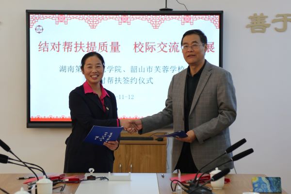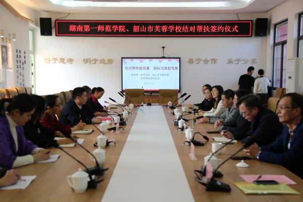 为了进一步加强校际交流,真正实现“资源共享、优势互补、共同提高” 的帮扶目标,促进韶山市芙蓉学校教师成长,11月12日,湖南第一师范学院、韶山市芙蓉学校结对帮扶签约仪式在韶山市芙蓉学校举行。韶山市市委常委、市委宣传部部长李先金,韶山市政协副主席、韶山市教育局副局长庞石林、我校党委委员、副校长江正云,教务处处长蒋蓉、基础教育发展部主任欧立新出席仪式。仪式由庞石林主持。