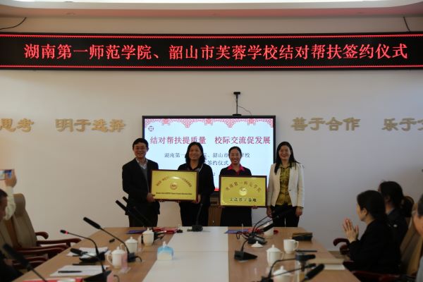 仪式上,蒋蓉、欧立新为韶山市芙蓉学校授予“湖南第一师范学院产学研基地”及“湖南第一师范学院小学教师教育联盟成员单位”牌匾。江正云、方芳、章醇分别与韶山市芙蓉学校签订结对帮扶协议。